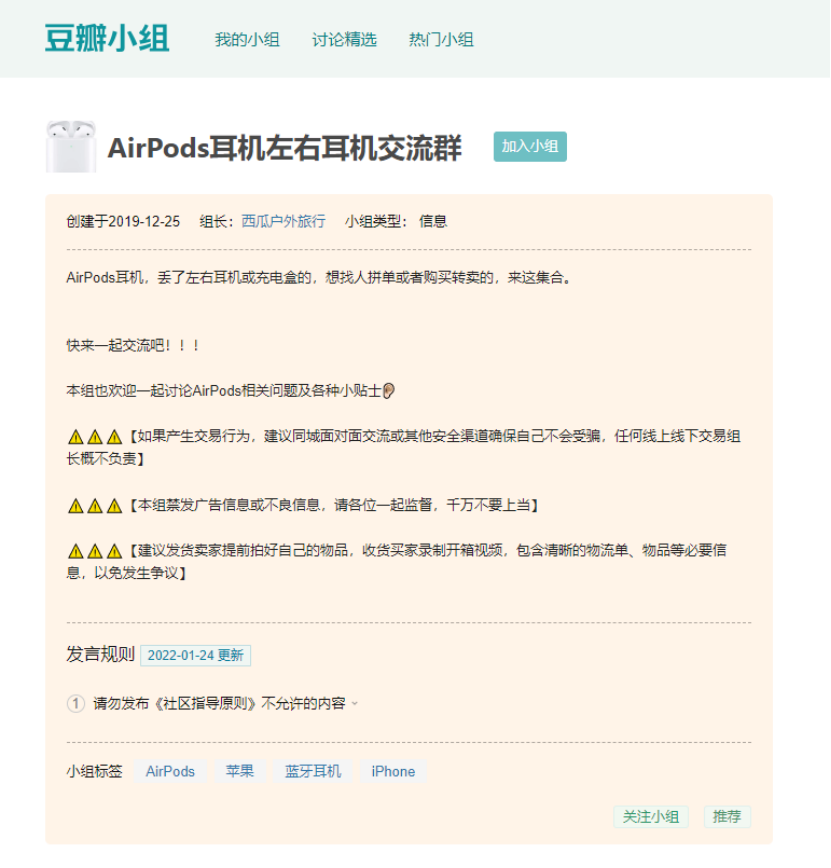 豆瓣上甚至有专门的AirPods交流小组,为那些因意外而“离异”的AirPods家庭提供交流机会。(图/豆瓣)