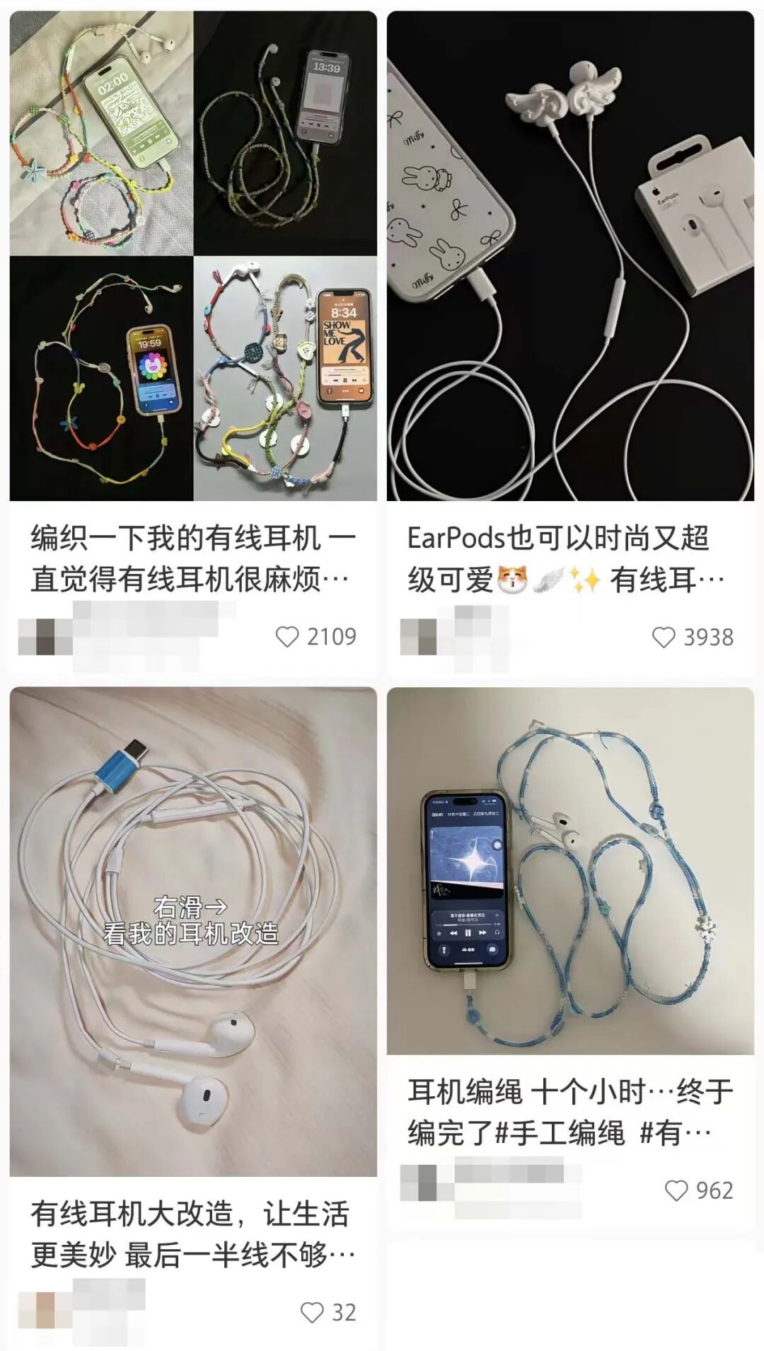 甚至有人专买“不能听歌的有线耳机”当作项链平替,或者给有线耳机缠上彩线水钻,改造成独一无二的配饰。